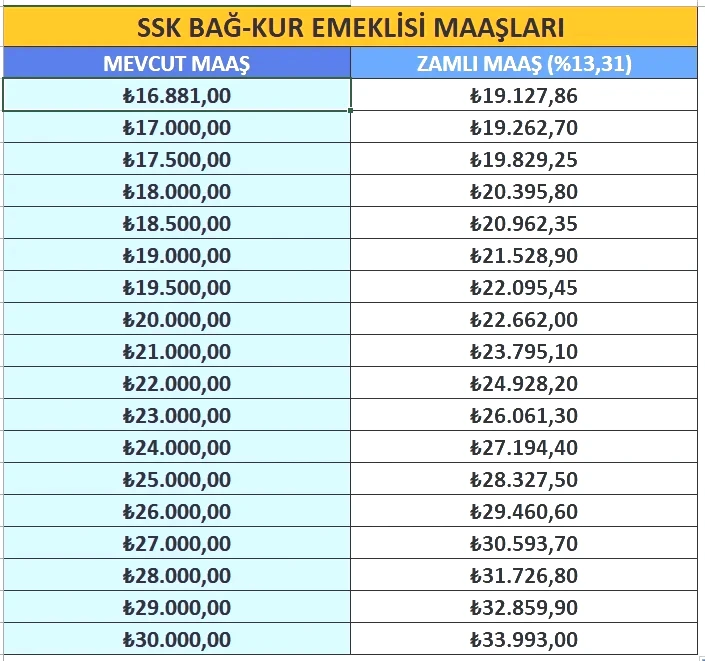 İşte, emekli maaşı hesaplamasına ilişkin tablo: