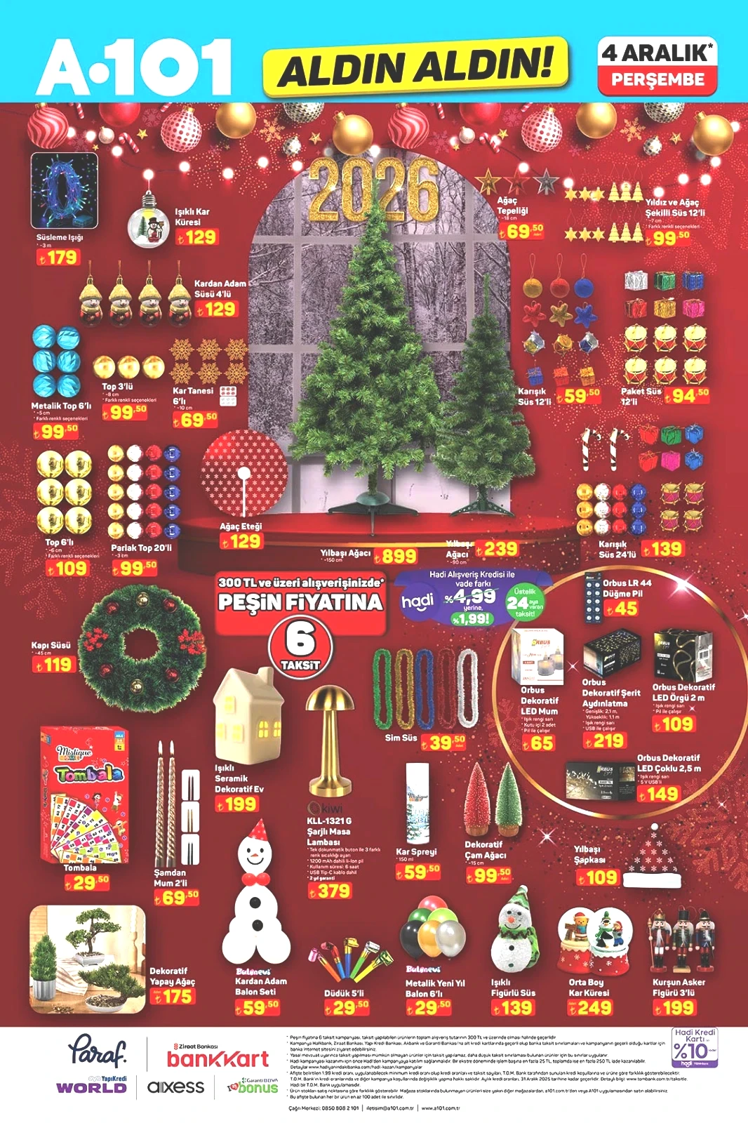 A101, 4 Aralık Perşembe itibarıyla yılbaşı temalı ürünlerde göz alıcı indirimler sunmaya başlıyor. Yeni yıl süslemeleri ve ağaçlarından yüzlerce ürünü A101 mağazaları, A101 Kapıda ve A101 Ekstra’da bulabilirsiniz.
