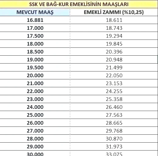 Eylül ayında emekliler %7,50 oranında bir zam elde etmişti. O ayki enflasyon %2,55 düzeyinde gerçekleşirken, 4 aylık enflasyon oranı %10,25’e ulaştı. Böylece SGK ve Bağ-Kur emeklileri zaten %10,25’lik bir zammı garanti altına aldı. Yeni zam oranıyla birlikte 16.881 TL olan en düşük SGK ve Bağ-Kur emeklisi maaşı, 18.611 TL’ye yükselecek. Bu rakam, kasım ve aralık ayı enflasyon verileriyle daha da artabilecektir.