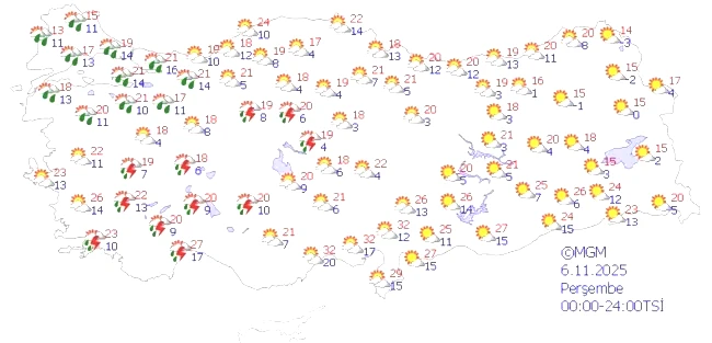 6 Kasım Perşembe: İstanbul, Ankara ve Bursa'nın da bulunduğu birçok ilde sağanak yağış öngörülmektedir.