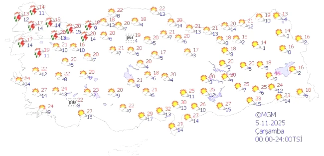 Meteoroloji'nin yaptığı açıklamada, "Ülkemizin genelinde parçalı ve yer yer çok bulutlu bir hava durumu hakim olacak. Trakya, İç Anadolu'nun doğu kesimi, Çanakkale ve Tokat çevreleri ile İstanbul'un batı bölgelerinde sağanak ve gök gürültülü sağanak yağışlar bekleniyor. Ayrıca Marmara, İç Ege ve Batı Karadeniz kız bölümlerinde pus ve zaman zaman sis bekleniyor." ifadeleri yer aldı.