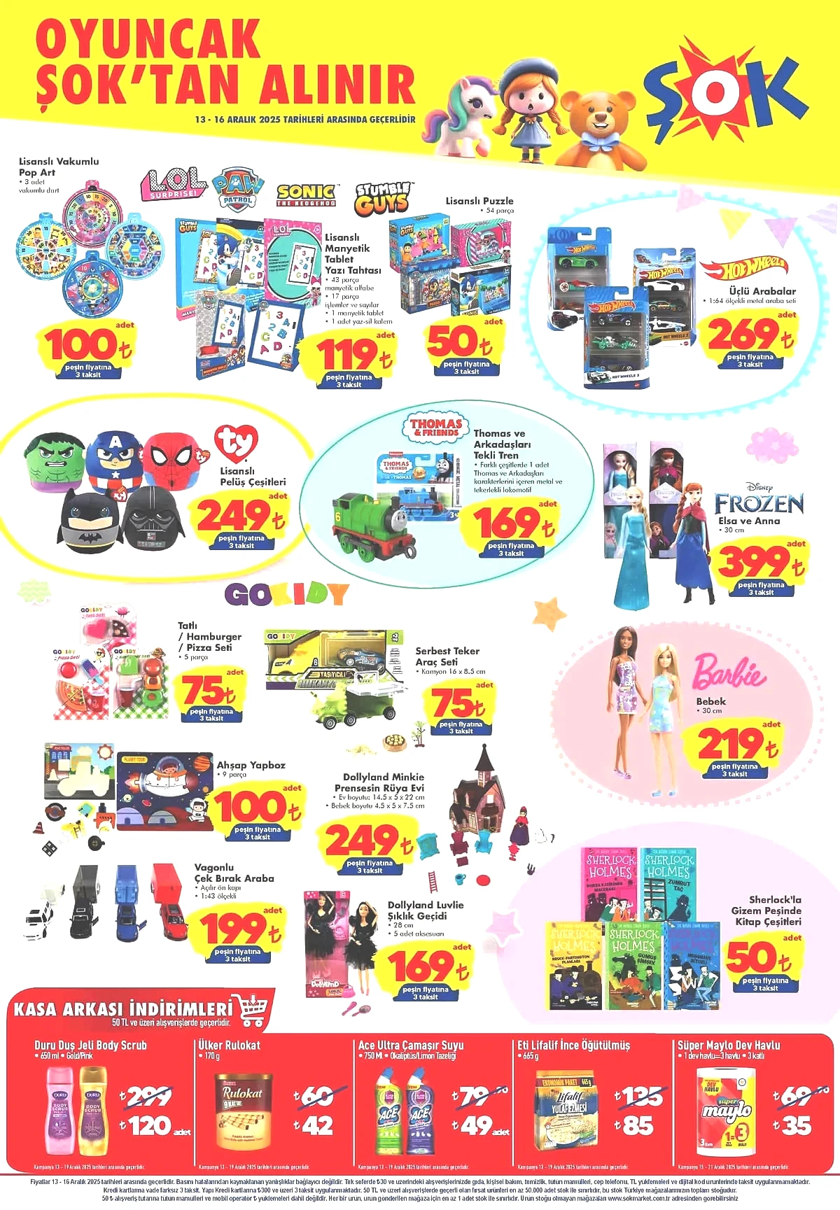 ŞOK’un oyuncak kampanyasında farklı yaş gruplarına hitap eden lisanslı ürünler ön planda. LOL, Paw Patrol, Disney Frozen, Barbie ve Thomas & Friends gibi tanınmış markalar cazip fiyatlarla müşterilere sunuluyor.